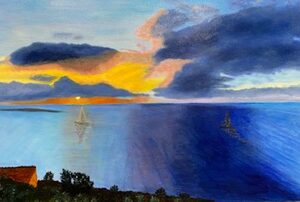 TÍTULO: Tempestad de colores TÉCNICA: Oleo sobre lienzo MEDIDAS: 60 x 40 cm AUTOR: Rosario Escudero CONTACTO: finaestampasuper@yahoo.es COMENTARIO DEL AUTOR: De vuelta de un viaje por la Sierra de Cazorla los colores azules del mar y del cielo me emocionaron y capte en una fotografía la salida del sol.